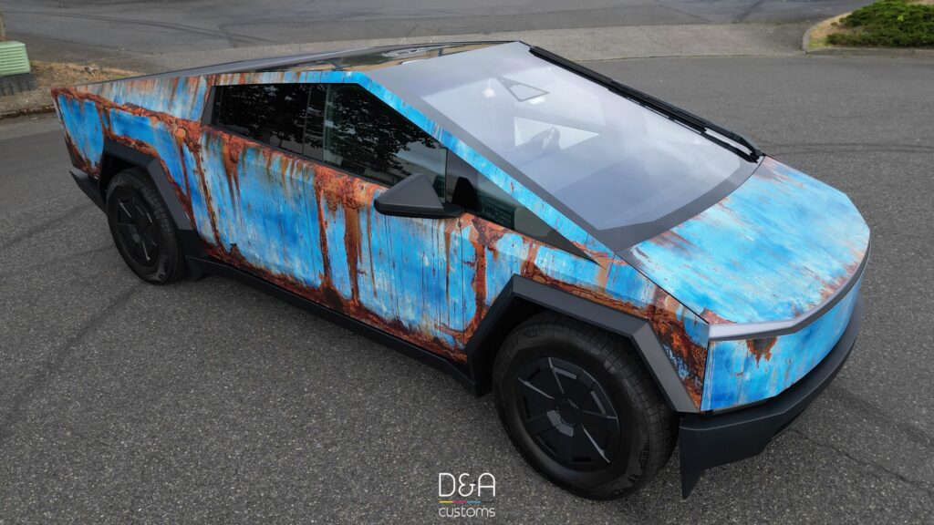 What makes it special? D&A Customs applied a full-body vinyl film that mimics decades of weathered blue paint and deep brown oxidation while the real stainless steel stays untouched. High-resolution printing, matte laminate, and seamless panel alignment turn the effect into a show-stopping illusion—viewers need to tap the body to realise it is film, not rust. Tesla’s own wrap programme offers colour films, yet nothing this radical.